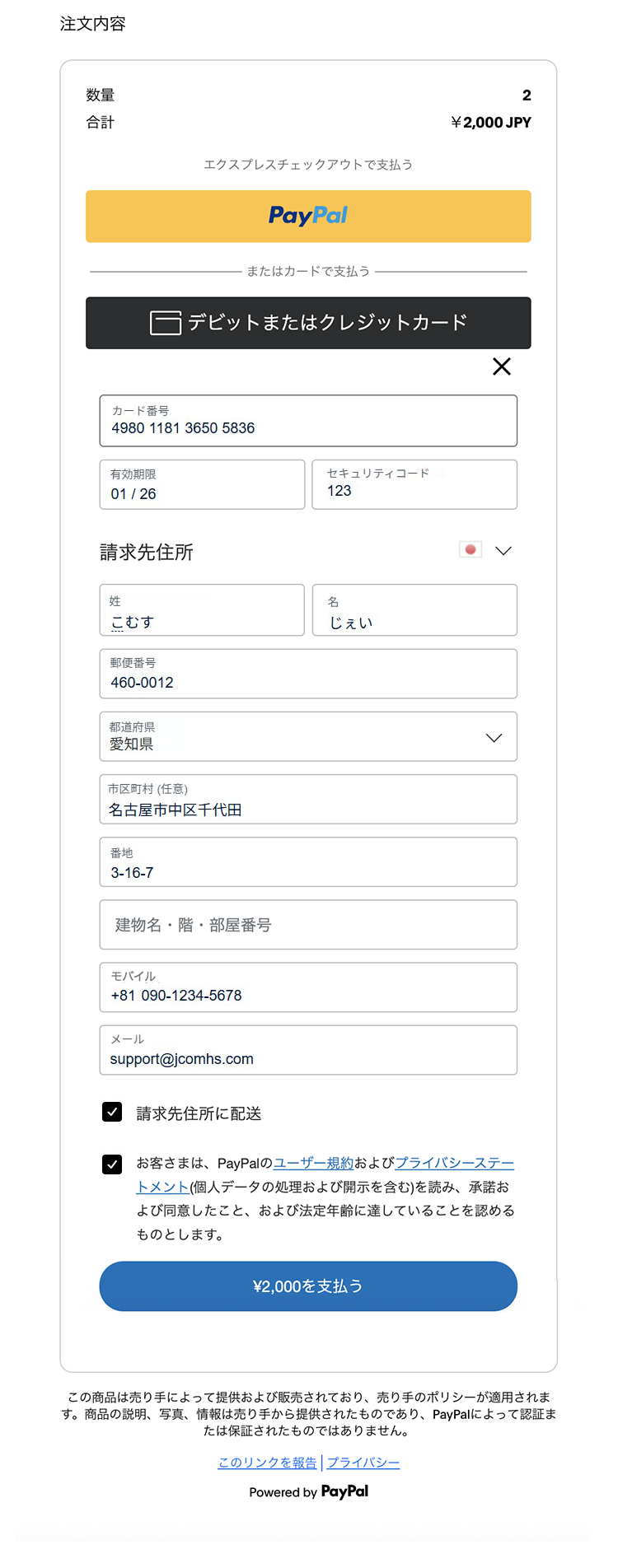 PayPalアカウントをお持ちでない方も、クレジットカード情報をご入力いただくことでお支払いいただけます。